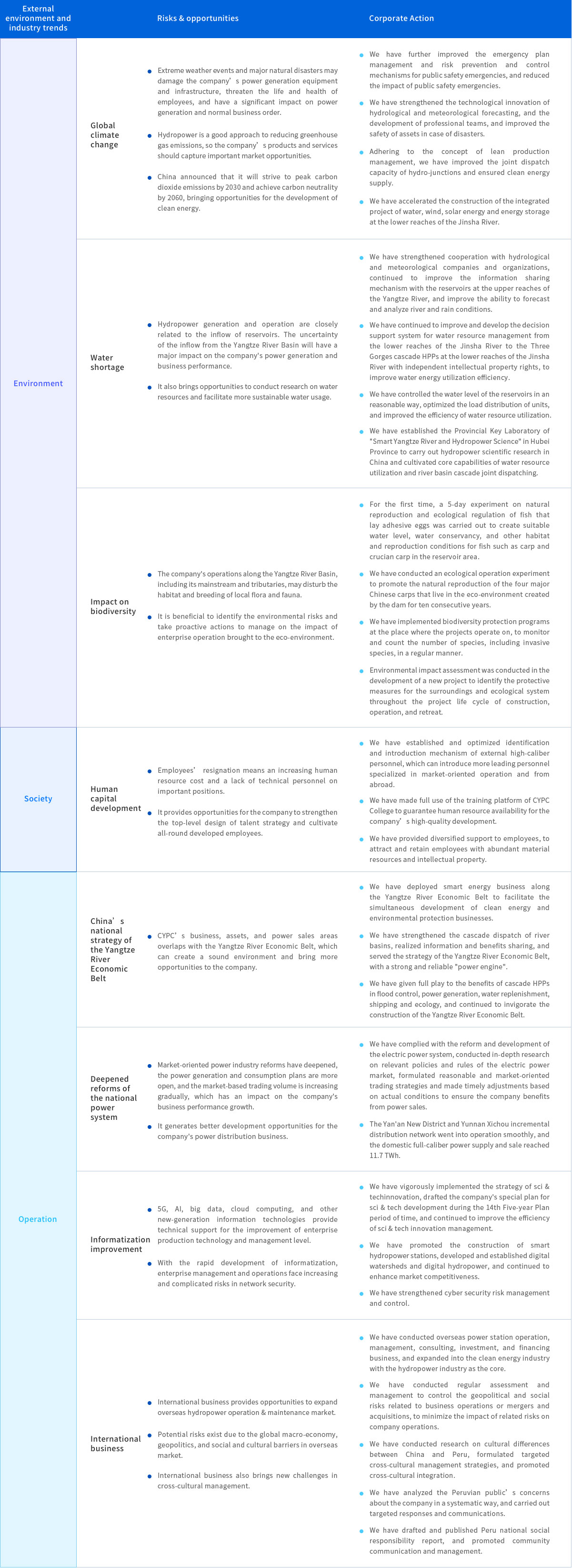 CYPC has takene into account the multi-dimensional impact of global climate change, power market reforms, policies and regulations on the company's strategy, market, and operations, and regularly carried out risk identification, evaluation, and management improvement to push forward the sustainable development.